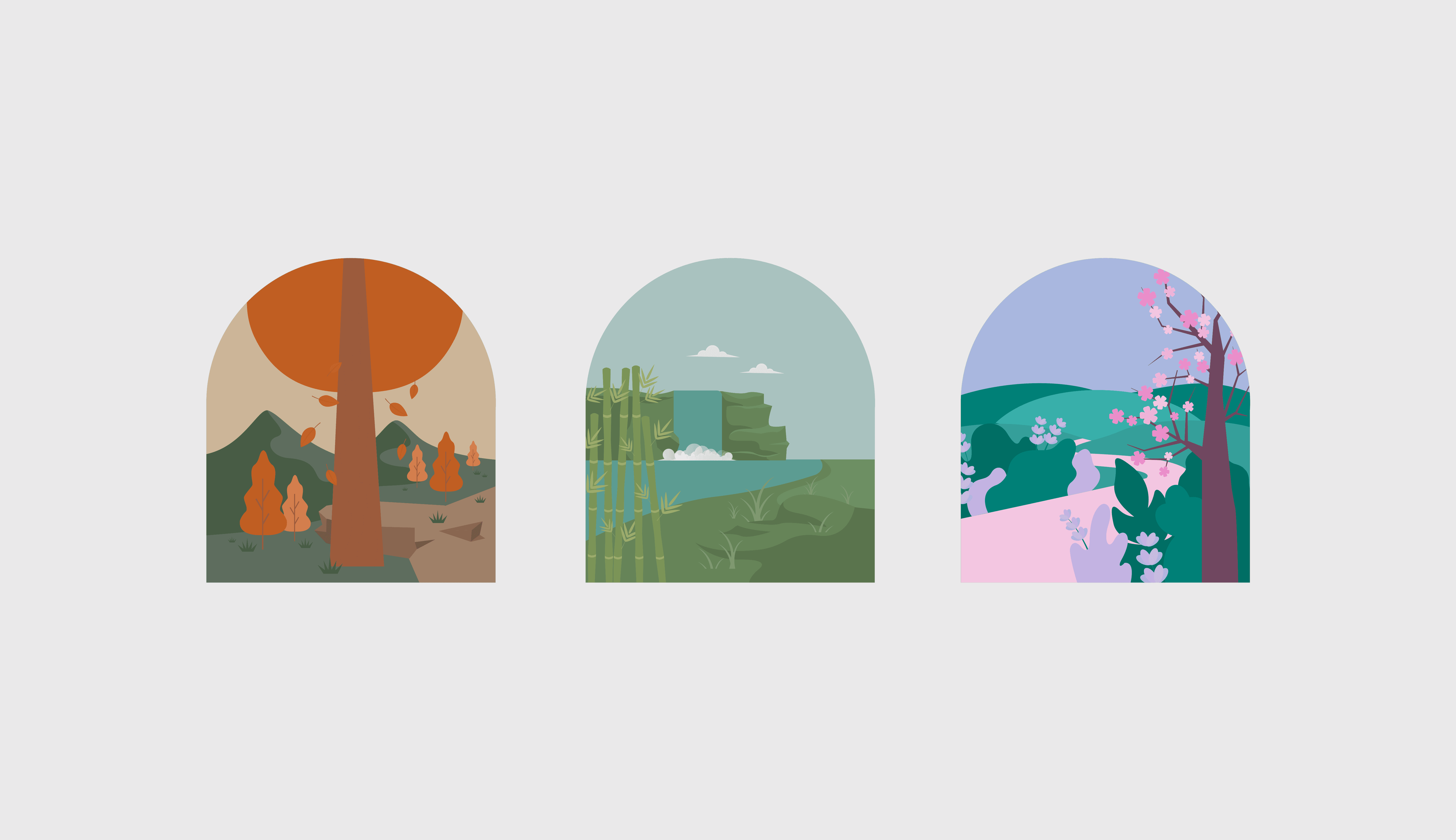 A estética, guiada pelas formas, transformou cenários da natureza em ilustrações estimulantes inspiradas nas três linhas de aromas da marca, criando uma paleta de cores rica representando a pluralidade da flora, com ícones desenvolvidos para cada aroma.